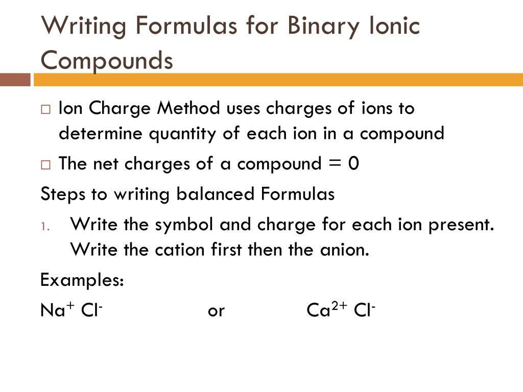 Writing Formulas for Binary Ionic Compounds • Ion Charge Method uses charges of ions to determine quantity of each ion in a compound • The net charges of a compound = 0 Steps to writing balanced Formulas • Write the symbol and charge for each ion present. Write the cation first then the anion. Examples: Na+Cl- or Ca2+Cl-