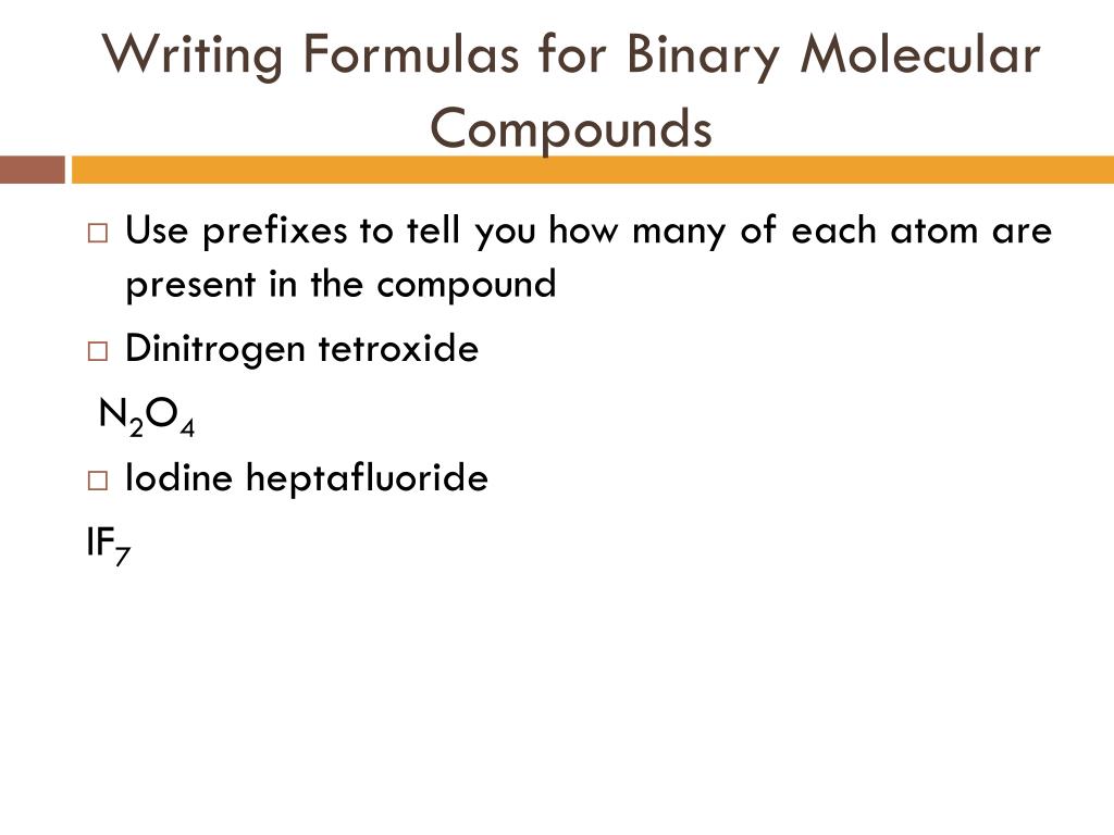 Writing Formulas for Binary Molecular Compounds • Use prefixes to tell you how many of each atom are present in the compound • Dinitrogentetroxide N2O4 • Iodine heptafluoride IF7