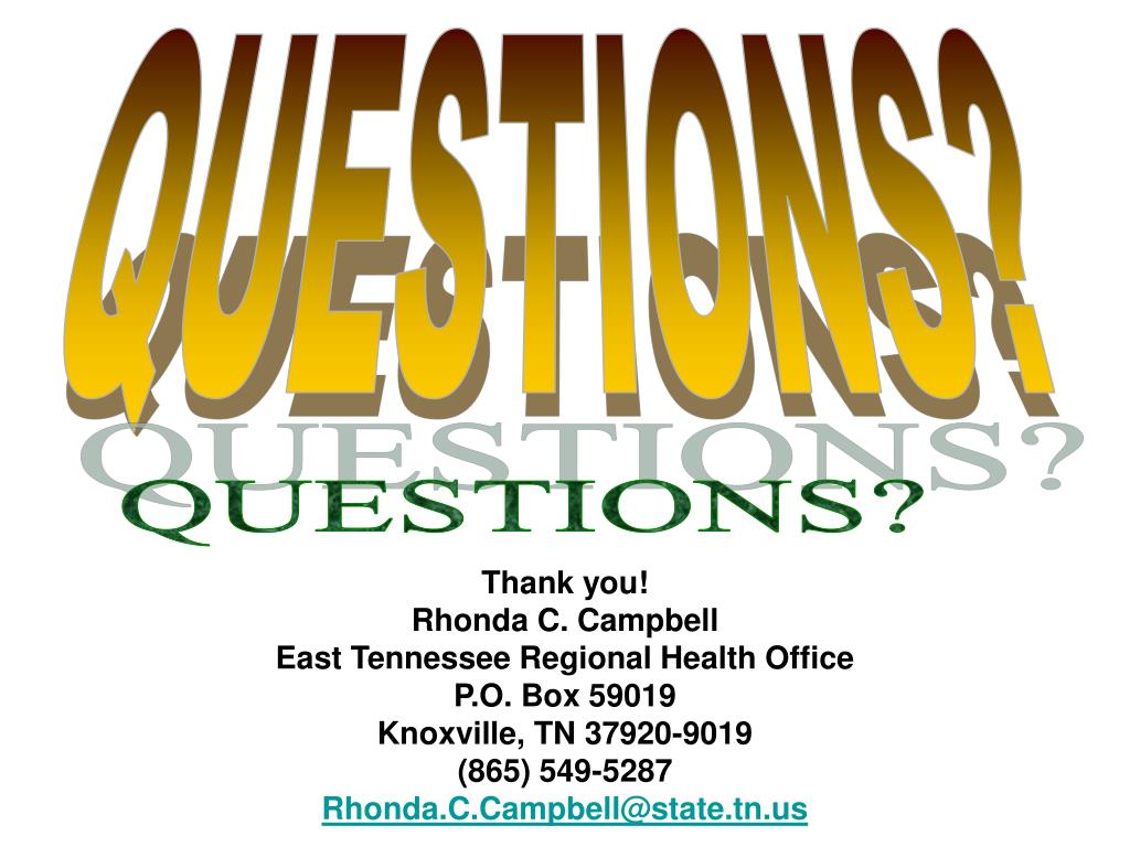 Thank you! Rhonda C. Campbell East Tennessee Regional Health Office P.O. Box 59019 Knoxville, TN 37920-9019 (865) 549-5287 Rhonda.C.Campbell@state.tn.us QUESTIONS? QUESTIONS?