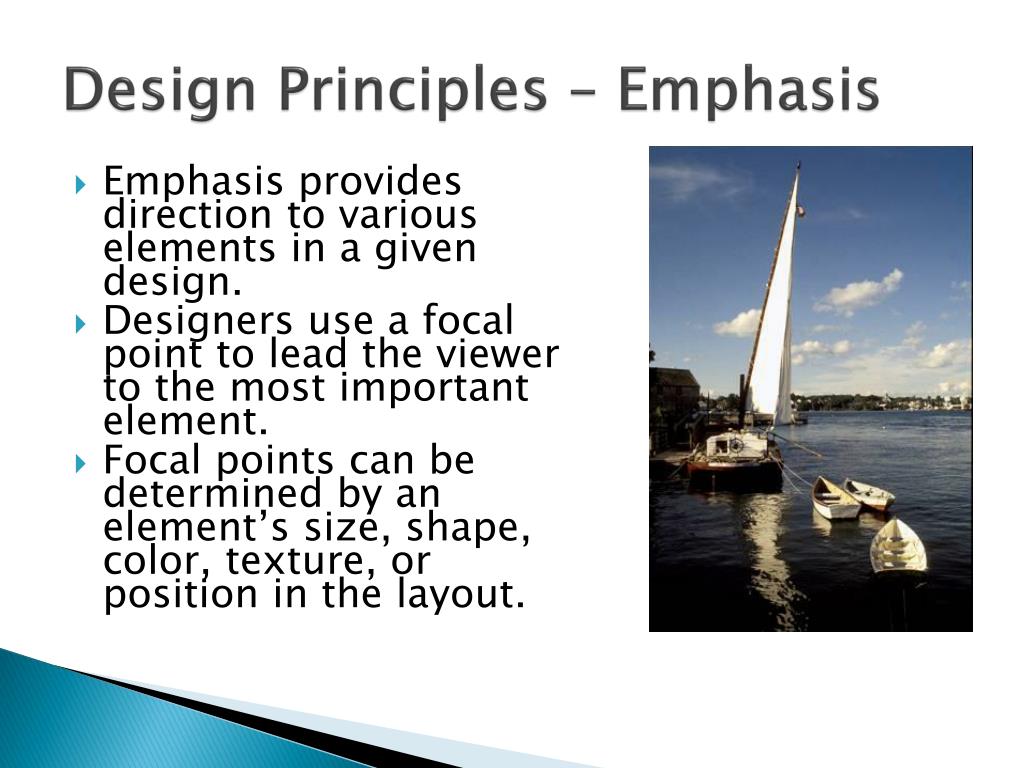 Design Principles – Emphasis • Emphasis provides direction to various elements in a given design. • Designers use a focal point to lead the viewer to the most important element. • Focal points can be determined by an element’s size, shape, color, texture, or position in the layout.
