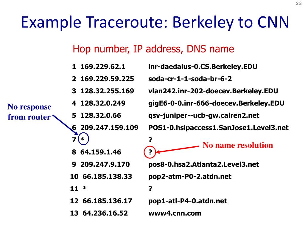 No response from router No name resolution Example Traceroute: Berkeley to CNN Hop number, IP address, DNS name 1 169.229.62.1 2 169.229.59.225 3 128.32.255.169 4 128.32.0.249 5 128.32.0.66 6 209.247.159.109 7 * 8 64.159.1.46 9 209.247.9.170 10 66.185.138.33 11 * 12 66.185.136.17 13 64.236.16.52 inr-daedalus-0.CS.Berkeley.EDU soda-cr-1-1-soda-br-6-2 vlan242.inr-202-doecev.Berkeley.EDU gigE6-0-0.inr-666-doecev.Berkeley.EDU qsv-juniper--ucb-gw.calren2.net POS1-0.hsipaccess1.SanJose1.Level3.net ? ? pos8-0.hsa2.Atlanta2.Level3.net pop2-atm-P0-2.atdn.net ? pop1-atl-P4-0.atdn.net www4.cnn.com