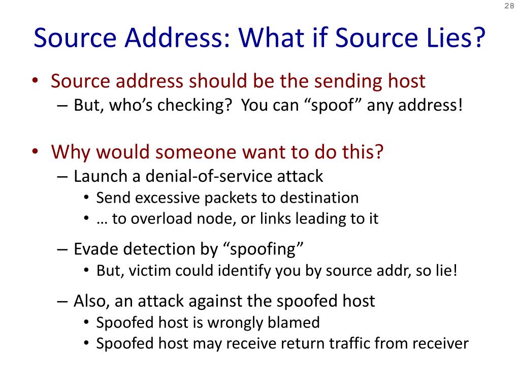 Source Address: What if Source Lies? • Source address should be the sending host • But, who’s checking? You can “spoof” any address! • Why would someone want to do this? • Launch a denial-of-service attack • Send excessive packets to destination • … to overload node, or links leading to it • Evade detection by “spoofing” • But, victim could identify you by source addr, so lie! • Also, an attack against the spoofed host • Spoofed host is wrongly blamed • Spoofed host may receive return traffic from receiver