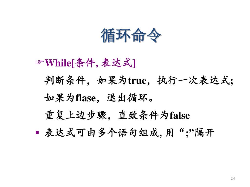 循环命令 • While[条件, 表达式] 判断条件,如果为true,执行一次表达式; 如果为flase,退出循环。 重复上边步骤,直致条件为false • 表达式可由多个语句组成, 用“;”隔开