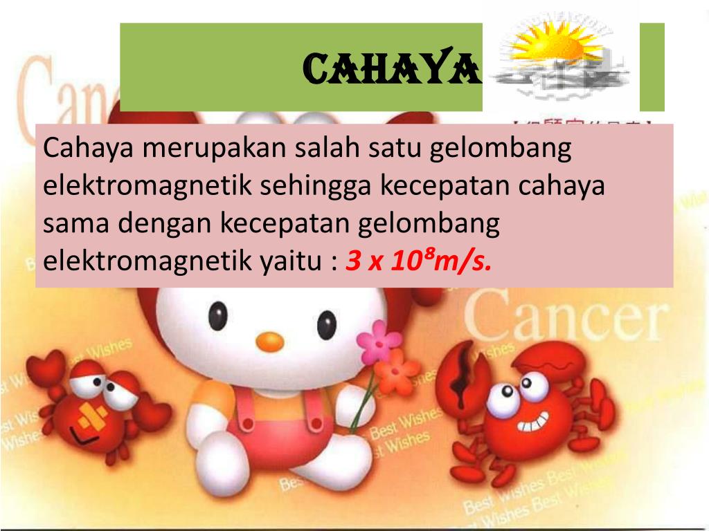 Cahaya Cahaya merupakan salah satu gelombang elektromagnetik sehingga kecepatan cahaya sama dengan kecepatan gelombang elektromagnetik yaitu : 3 x 10⁸m/s.