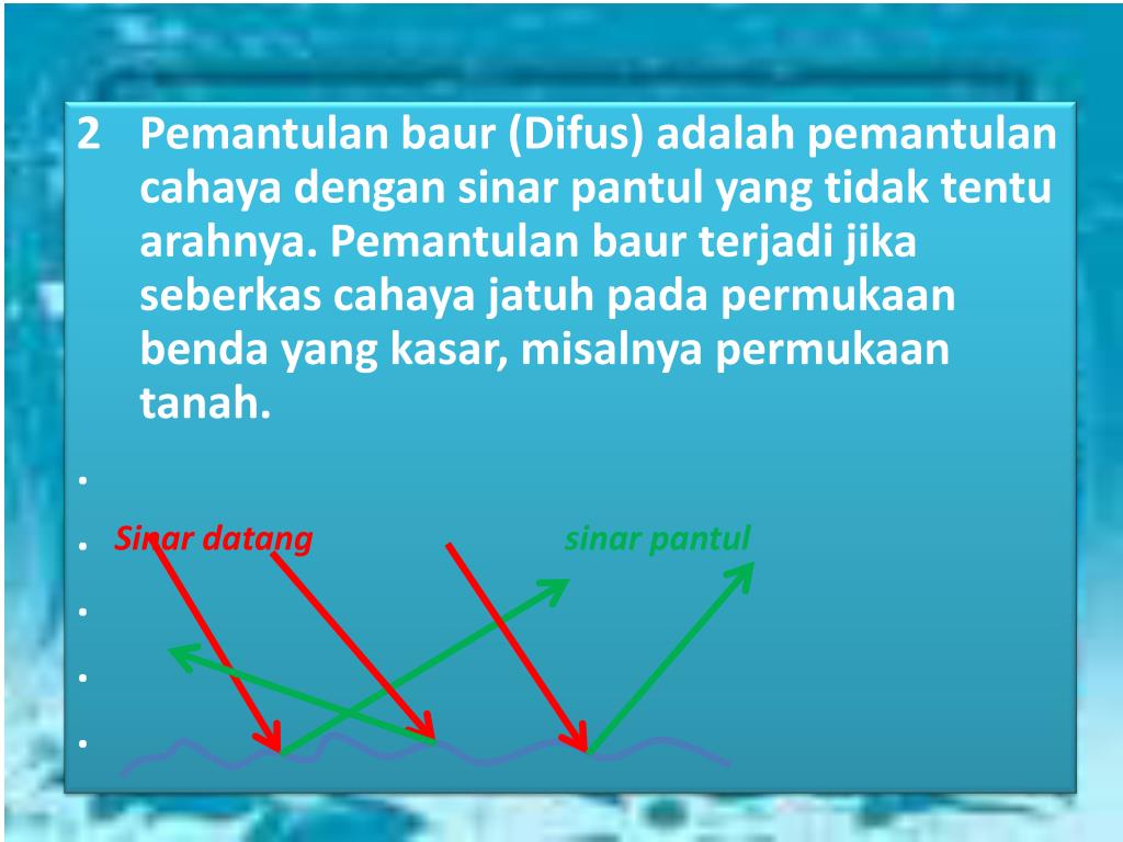 Pemantulan baur (Difus) adalah pemantulan cahaya dengan sinar pantul yang tidak tentu arahnya. Pemantulan baur terjadi jika seberkas cahaya jatuh pada permukaan benda yang kasar, misalnya permukaan tanah. . .Sinar datang sinar pantul . . .