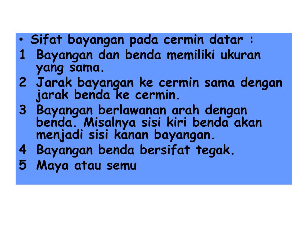 Sifat bayangan pada cermin datar : • Bayangan dan benda memiliki ukuran yang sama. • Jarak bayangan ke cermin sama dengan jarak benda ke cermin. • Bayangan berlawanan arah dengan benda. Misalnya sisi kiri benda akan menjadi sisi kanan bayangan. • Bayangan benda bersifat tegak. • Maya atau semu