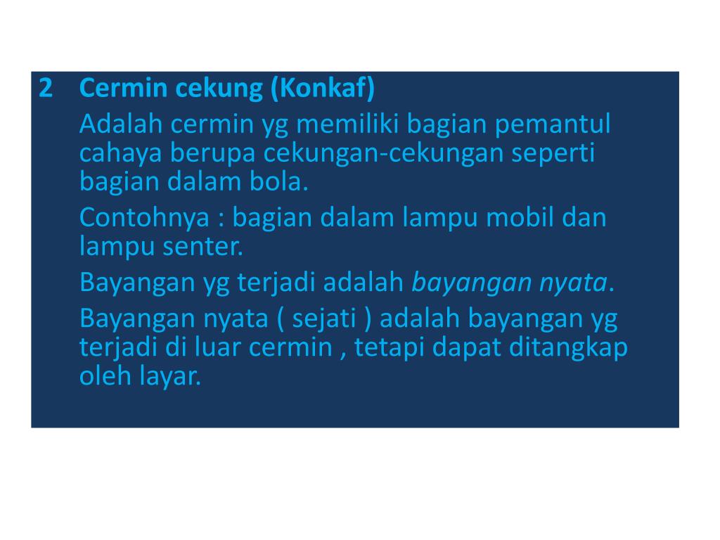Cermin cekung (Konkaf) Adalah cermin yg memiliki bagian pemantul cahaya berupa cekungan-cekungan seperti bagian dalam bola. Contohnya : bagian dalam lampu mobil dan lampu senter. Bayangan yg terjadi adalah bayangan nyata. Bayangan nyata ( sejati ) adalah bayangan yg terjadi di luar cermin , tetapi dapat ditangkap oleh layar.