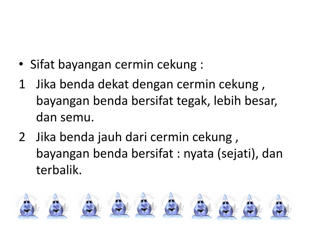 Sifat bayangan cermin cekung : • Jika benda dekat dengan cermin cekung , bayangan benda bersifat tegak, lebih besar, dan semu. • Jika benda jauh dari cermin cekung , bayangan benda bersifat : nyata (sejati), dan terbalik.