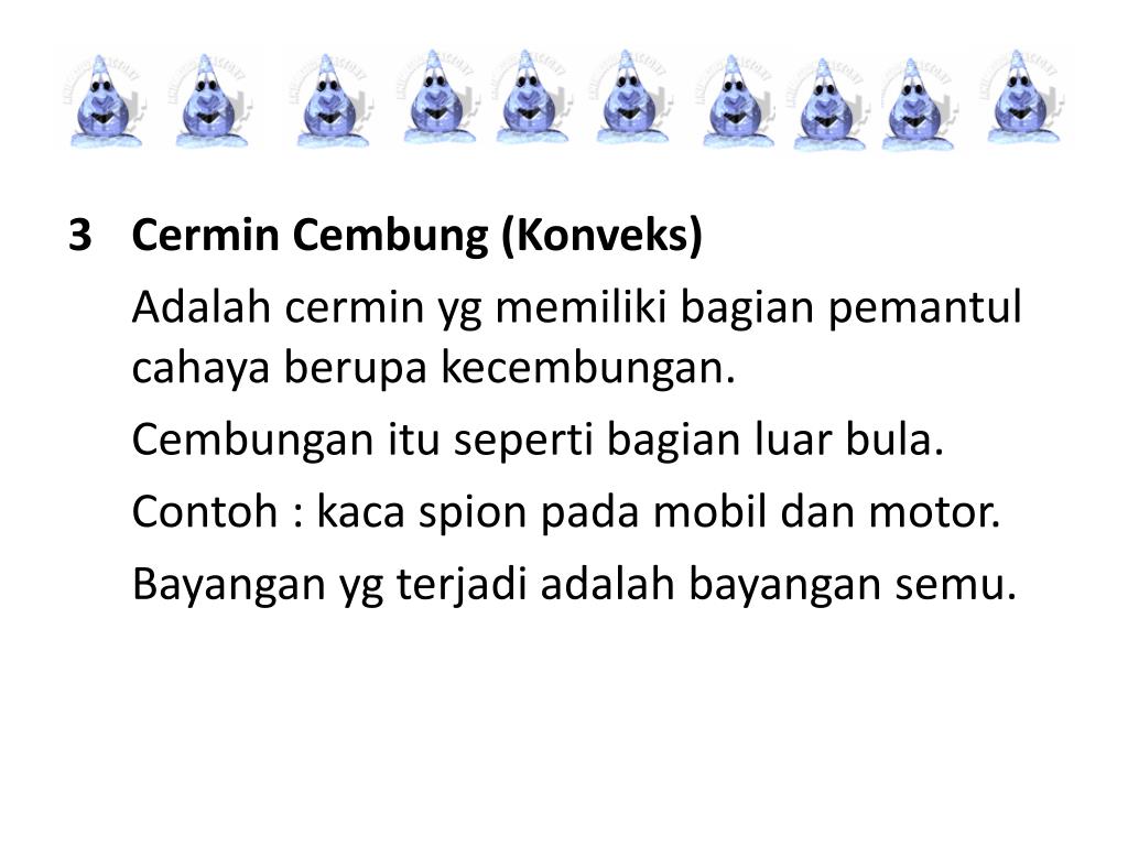 Cermin Cembung (Konveks) Adalah cermin yg memiliki bagian pemantul cahaya berupa kecembungan. Cembungan itu seperti bagian luar bula. Contoh : kaca spion pada mobil dan motor. Bayangan yg terjadi adalah bayangan semu.
