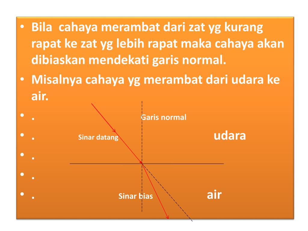 Bila cahaya merambat dari zat yg kurang rapat ke zat yg lebih rapat maka cahaya akan dibiaskan mendekati garis normal. • Misalnya cahaya yg merambat dari udara ke air. • . Garis normal • . Sinar datang udara • . • . • . Sinar bias air