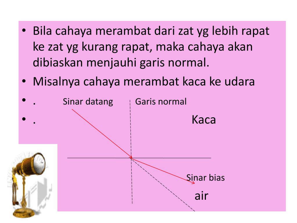 Bila cahaya merambat dari zat yg lebih rapat ke zat yg kurang rapat, maka cahaya akan dibiaskan menjauhi garis normal. • Misalnya cahaya merambat kaca ke udara • . Sinar datang Garis normal • . Kaca . . Sinar bias air