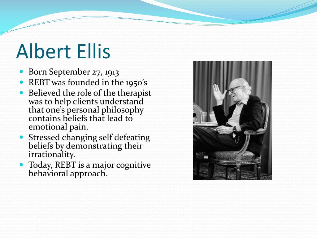 Rational Emotive Behavior Therapy (REBT). Noemi Legaspi-Valverde. Albert Ellis. Born September 27, 1913 REBT was founded in the 1950’s Believed the role of the therapist was to help clients understand that one’s personal philosophy contains beliefs that lead to emotional pain.