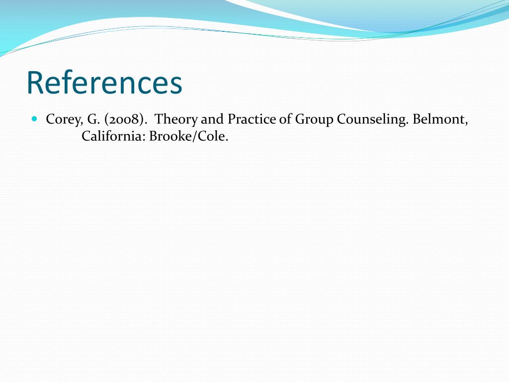 References • Corey, G. (2008). Theory and Practice of Group Counseling. Belmont, California: Brooke/Cole.