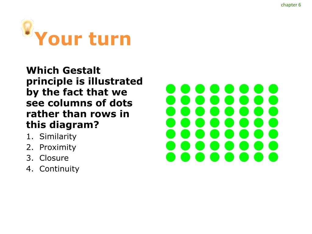 chapter 6 Your turn Which Gestalt principle is illustrated by the fact that we see columns of dots rather than rows in this diagram? 1. Similarity 2. Proximity 3. Closure 4. Continuity