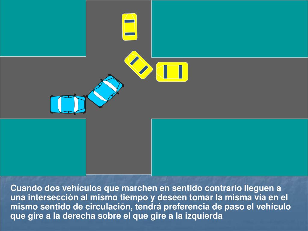Cuando dos vehículos que marchen en sentido contrario lleguen a una intersección al mismo tiempo y deseen tomar la misma vía en el mismo sentido de circulación, tendrá preferencia de paso el vehículo que gire a la derecha sobre el que gire a la izquierda