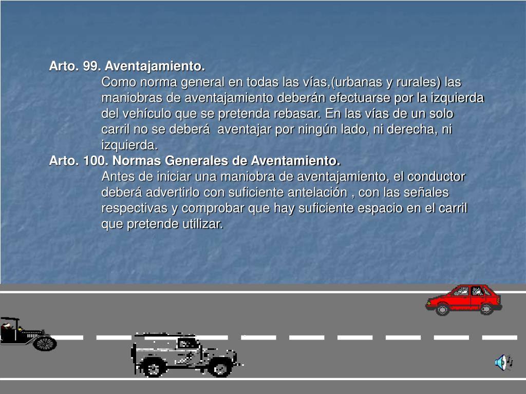 C: ARTO. 100, AL 1O4/ P. QUIJANO/W Arto. 103. De la Ejecución. Durante el aventajamiento, el conductor que lo efectúe; deber conducir su vehículo con una velocidad notoriamente superior a la del que pretende aventajar, dejando entre ambos una separación lateral suficiente para realizarlo con seguridad. Arto. 104. Supuesto Especial. A excepción de lo dispuesto en el artículo anterior, se podrá ejecutar la maniobra de aventajamiento siempre y cuando se encuentre inmovilizado un vehículo. La ley prohíbe adelantar en línea continua amarilla cuando los dos vehículos están en marcha. Arto. 26 # 8, C$ 300, a esta infracción, también se le incluye la # 9 invasión de carril C$ 400.