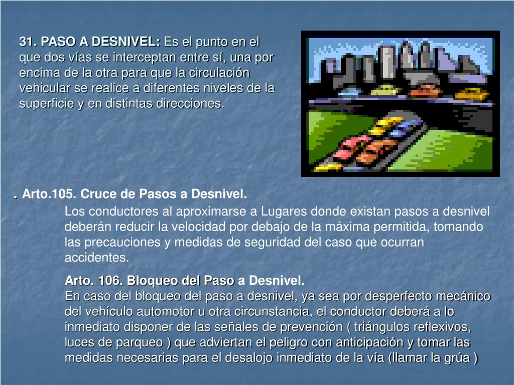 31. PASO A DESNIVEL: Es el punto en el que dos vías se interceptan entre sí, una por encima de la otra para que la circulación vehicular se realice a diferentes niveles de la superficie y en distintas direcciones. . Arto.105. Cruce de Pasos a Desnivel. Los conductores al aproximarse a Lugares donde existan pasos a desnivel deberán reducir la velocidad por debajo de la máxima permitida, tomando las precauciones y medidas de seguridad del caso que ocurran accidentes. Arto. 106. Bloqueo del Paso a Desnivel. En caso del bloqueo del paso a desnivel, ya sea por desperfecto mecánico del vehículo automotor u otra circunstancia, el conductor deberá a lo inmediato disponer de las señales de prevención ( triángulos reflexivos, luces de parqueo ) que adviertan el peligro con anticipación y tomar las medidas necesarias para el desalojo inmediato de la vía (llamar la grúa )