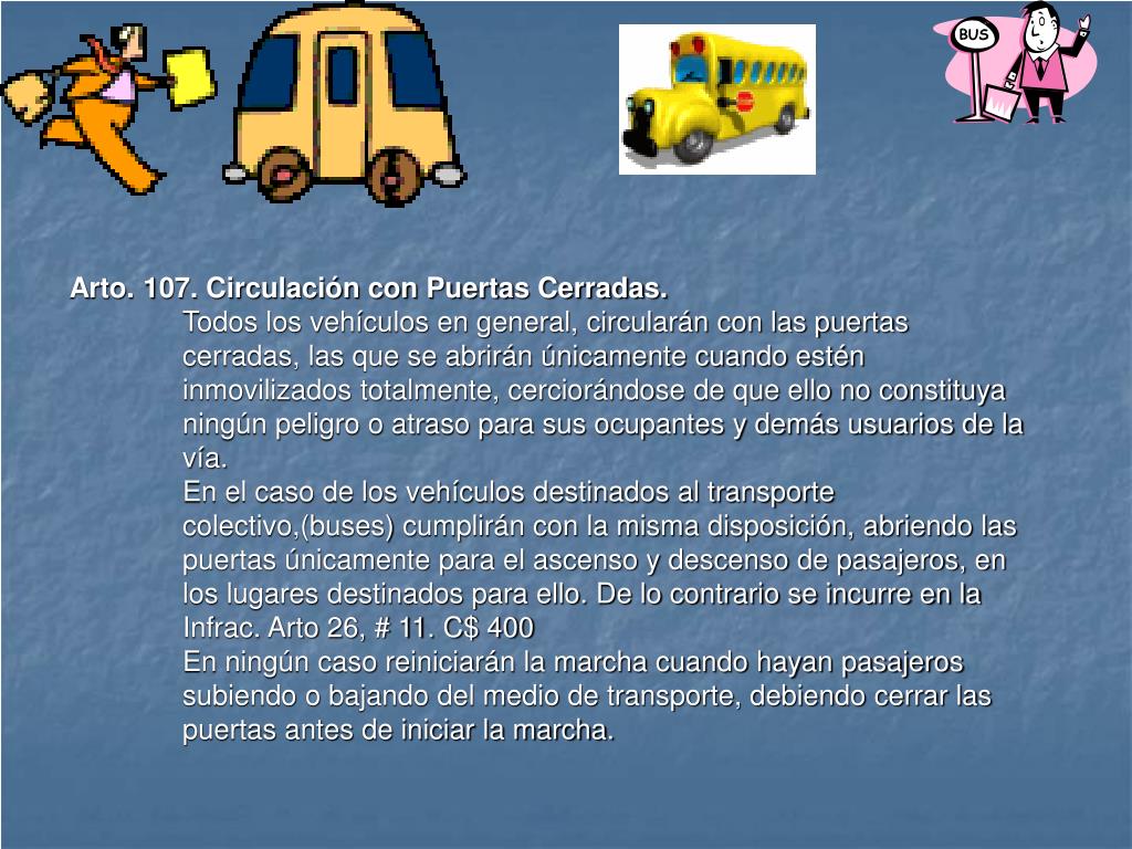Arto. 107. Circulación con Puertas Cerradas. Todos los vehículos en general, circularán con las puertas cerradas, las que se abrirán únicamente cuando estén inmovilizados totalmente, cerciorándose de que ello no constituya ningún peligro o atraso para sus ocupantes y demás usuarios de la vía. En el caso de los vehículos destinados al transporte colectivo,(buses) cumplirán con la misma disposición, abriendo las puertas únicamente para el ascenso y descenso de pasajeros, en los lugares destinados para ello. De lo contrario se incurre en la Infrac. Arto 26, # 11. C$ 400 En ningún caso reiniciarán la marcha cuando hayan pasajeros subiendo o bajando del medio de transporte, debiendo cerrar las puertas antes de iniciar la marcha.