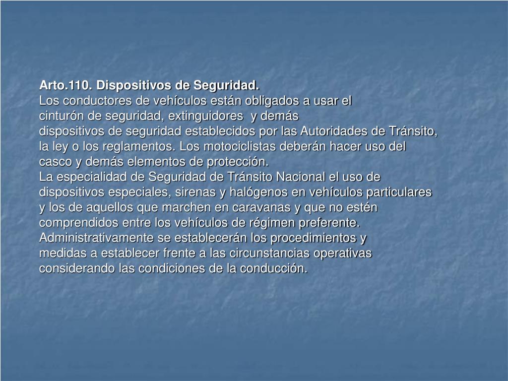 Arto.110. Dispositivos de Seguridad. Los conductores de vehículos están obligados a usar el cinturón de seguridad, extinguidores y demás dispositivos de seguridad establecidos por las Autoridades de Tránsito, la ley o los reglamentos. Los motociclistas deberán hacer uso del casco y demás elementos de protección. La especialidad de Seguridad de Tránsito Nacional el uso de dispositivos especiales, sirenas y halógenos en vehículos particulares y los de aquellos que marchen en caravanas y que no estén comprendidos entre los vehículos de régimen preferente. Administrativamente se establecerán los procedimientos y medidas a establecer frente a las circunstancias operativas considerando las condiciones de la conducción.