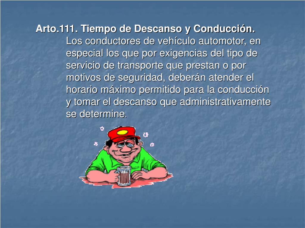 Arto.111. Tiempo de Descanso y Conducción. Los conductores de vehículo automotor, en especial los que por exigencias del tipo de servicio de transporte que prestan o por motivos de seguridad, deberán atender el horario máximo permitido para la conducción y tomar el descanso que administrativamente se determine.