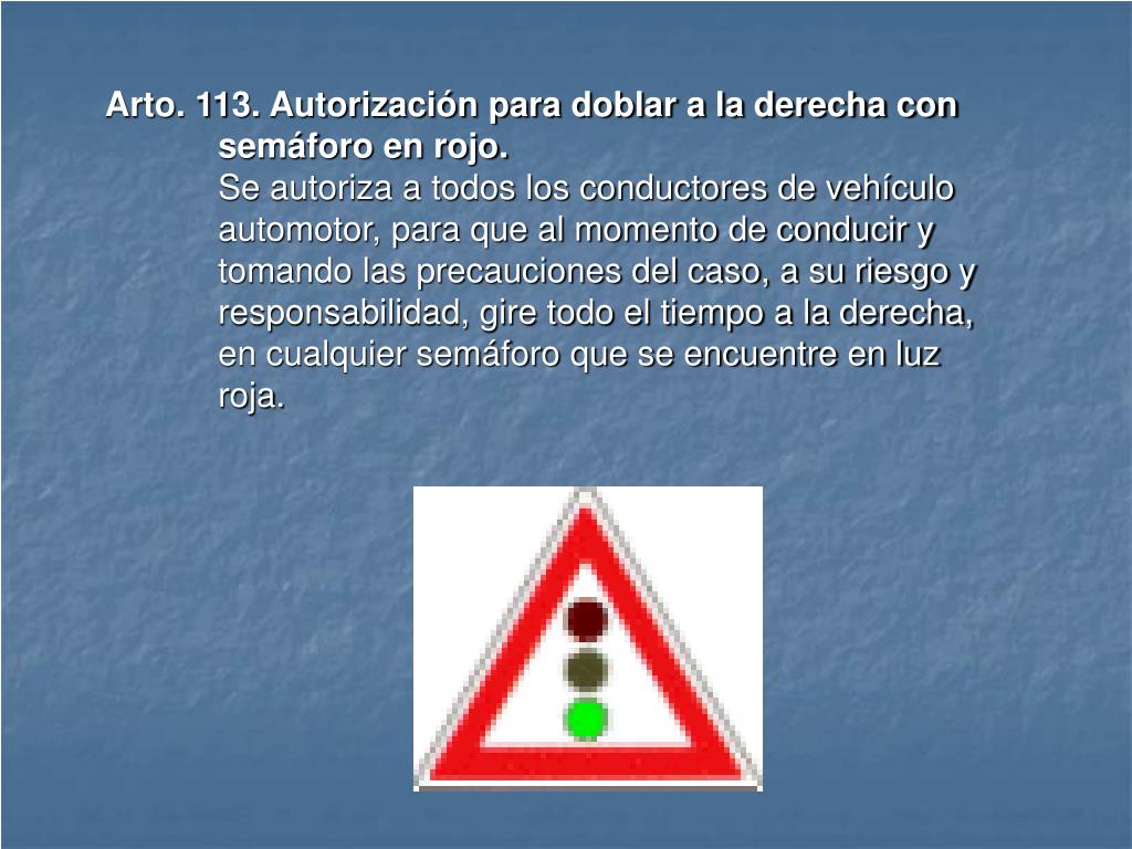 Arto. 113. Autorización para doblar a la derecha con semáforo en rojo. Se autoriza a todos los conductores de vehículo automotor, para que al momento de conducir y tomando las precauciones del caso, a su riesgo y responsabilidad, gire todo el tiempo a la derecha, en cualquier semáforo que se encuentre en luz roja.