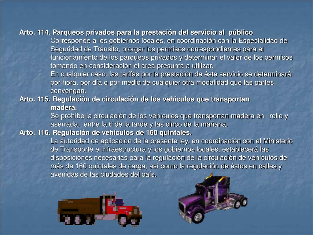 Arto. 114. Parqueos privados para la prestación del servicio al público Corresponde a los gobiernos locales, en coordinación con la Especialidad de Seguridad de Tránsito, otorgar los permisos correspondientes para el funcionamiento de los parqueos privados y determinar el valor de los permisos tomando en consideración el área presunta a utilizar. En cualquier caso, las tarifas por la prestación de éste servicio se determinará por hora, por día o por medio de cualquier otra modalidad que las partes convengan. Arto. 115. Regulación de circulación de los vehículos que transportan madera. Se prohíbe la circulación de los vehículos que transportan madera en rollo y aserrada, entre la 6 de la tarde y las cinco de la mañana. Arto. 116. Regulación de vehículos de 160 quintales. La autoridad de aplicación de la presente ley, en coordinación con el Ministerio de Transporte e Infraestructura y los gobiernos locales, establecerá las disposiciones necesarias para la regulación de la circulación de vehículos de más de 160 quintales de carga, así como la regulación de éstos en calles y avenidas de las ciudades del país.