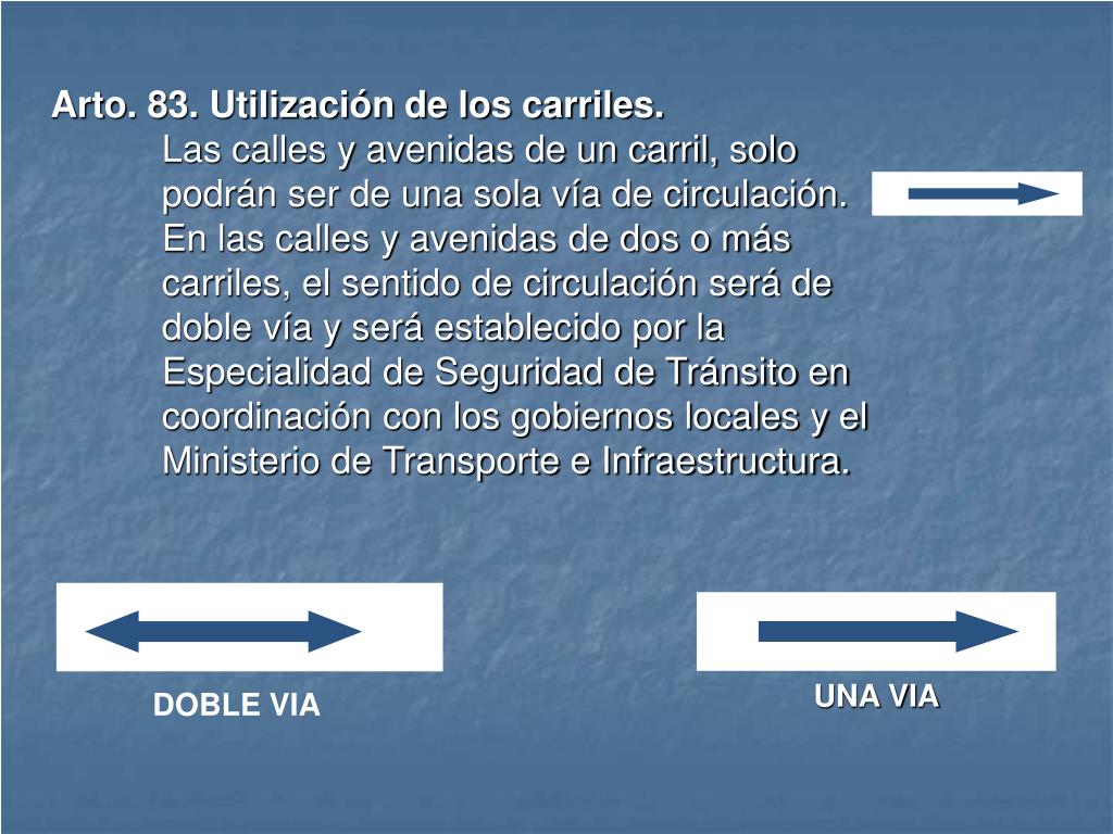 UNA VIA DOBLE VIA Arto. 83. Utilización de los carriles. Las calles y avenidas de un carril, solo podrán ser de una sola vía de circulación. En las calles y avenidas de dos o más carriles, el sentido de circulación será de doble vía y será establecido por la Especialidad de Seguridad de Tránsito en coordinación con los gobiernos locales y el Ministerio de Transporte e Infraestructura.