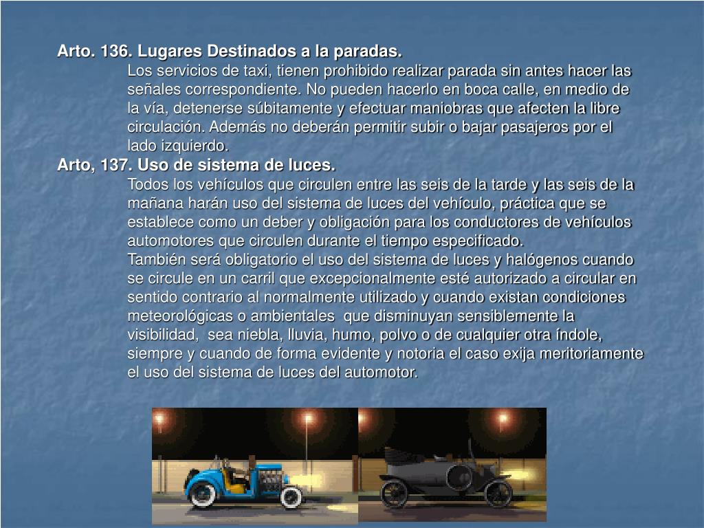 Arto. 136. Lugares Destinados a la paradas. Los servicios de taxi, tienen prohibido realizar parada sin antes hacer las señales correspondiente. No pueden hacerlo en boca calle, en medio de la vía, detenerse súbitamente y efectuar maniobras que afecten la libre circulación. Además no deberán permitir subir o bajar pasajeros por el lado izquierdo. Arto, 137. Uso de sistema de luces. Todos los vehículos que circulen entre las seis de la tarde y las seis de la mañana harán uso del sistema de luces del vehículo, práctica que se establece como un deber y obligación para los conductores de vehículos automotores que circulen durante el tiempo especificado. También será obligatorio el uso del sistema de luces y halógenos cuando se circule en un carril que excepcionalmente esté autorizado a circular en sentido contrario al normalmente utilizado y cuando existan condiciones meteorológicas o ambientales que disminuyan sensiblemente la visibilidad, sea niebla, lluvia, humo, polvo o de cualquier otra índole, siempre y cuando de forma evidente y notoria el caso exija meritoriamente el uso del sistema de luces del automotor.