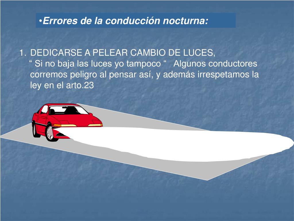 Errores de la conducción nocturna: • DEDICARSE A PELEAR CAMBIO DE LUCES, • “ Si no baja las luces yo tampoco “ Algunos conductores • corremos peligro al pensar así, y además irrespetamos la • ley en el arto.23