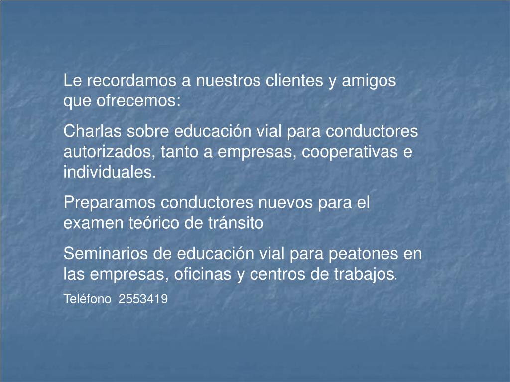 Le recordamos a nuestros clientes y amigos que ofrecemos: Charlas sobre educación vial para conductores autorizados, tanto a empresas, cooperativas e individuales. Preparamos conductores nuevos para el examen teórico de tránsito Seminarios de educación vial para peatones en las empresas, oficinas y centros de trabajos. Teléfono 2553419