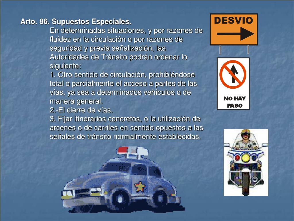 Arto. 86. Supuestos Especiales. • En determinadas situaciones, y por razones de fluidez en la circulación o por razones de seguridad y previa señalización, las Autoridades de Tránsito podrán ordenar lo siguiente: • 1. Otro sentido de circulación, prohibiéndose total o parcialmente el acceso a partes de las vías, ya sea a determinados vehículos o de manera general. • 2.-El cierre de vías. • 3. Fijar itinerarios concretos, o la utilización de arcenes o de carriles en sentido opuestos a las señales de tránsito normalmente establecidas.