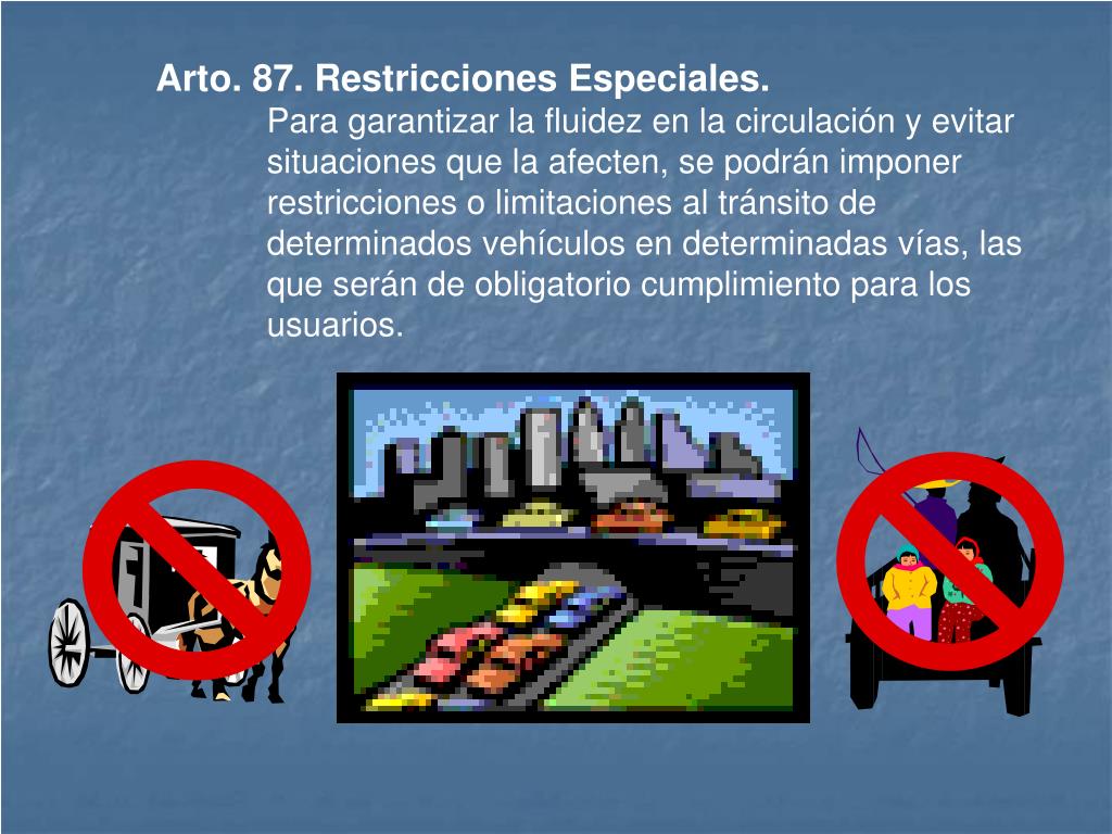 Arto. 87. Restricciones Especiales. Para garantizar la fluidez en la circulación y evitar situaciones que la afecten, se podrán imponer restricciones o limitaciones al tránsito de determinados vehículos en determinadas vías, las que serán de obligatorio cumplimiento para los usuarios.