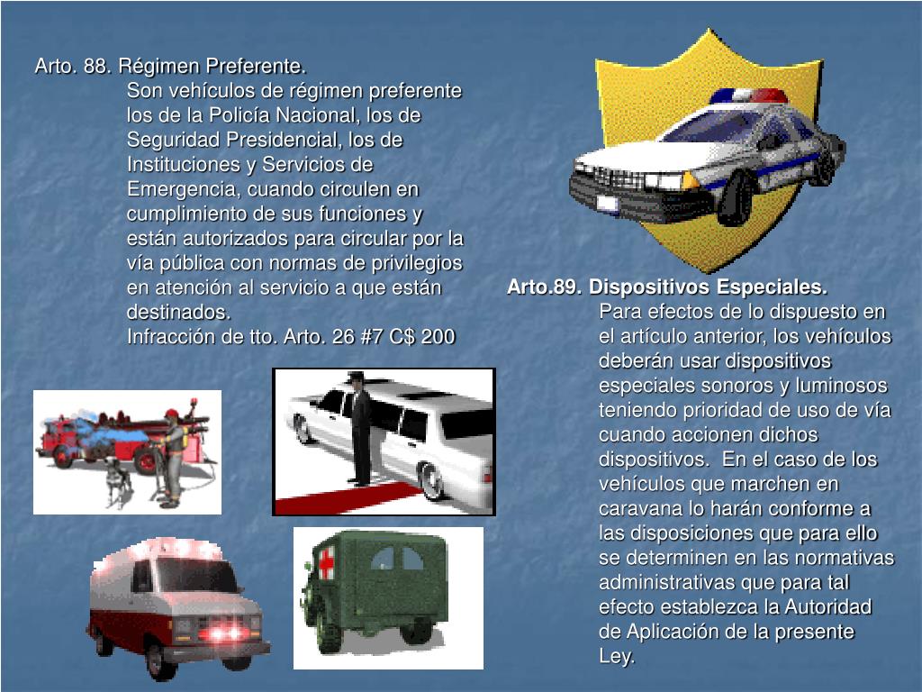 Arto. 88. Régimen Preferente. Son vehículos de régimen preferente los de la Policía Nacional, los de Seguridad Presidencial, los de Instituciones y Servicios de Emergencia, cuando circulen en cumplimiento de sus funciones y están autorizados para circular por la vía pública con normas de privilegios en atención al servicio a que están destinados. Infracción de tto. Arto. 26 #7 C$ 200 • Arto.89. Dispositivos Especiales. • Para efectos de lo dispuesto en el artículo anterior, los vehículos deberán usar dispositivos especiales sonoros y luminosos teniendo prioridad de uso de vía cuando accionen dichos dispositivos. En el caso de los vehículos que marchen en caravana lo harán conforme a las disposiciones que para ello se determinen en las normativas administrativas que para tal efecto establezca la Autoridad de Aplicación de la presente Ley.