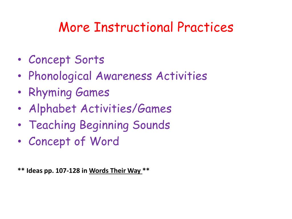 More Instructional Practices • Concept Sorts • Phonological Awareness Activities • Rhyming Games • Alphabet Activities/Games • Teaching Beginning Sounds • Concept of Word ** Ideas pp. 107-128 in Words Their Way **