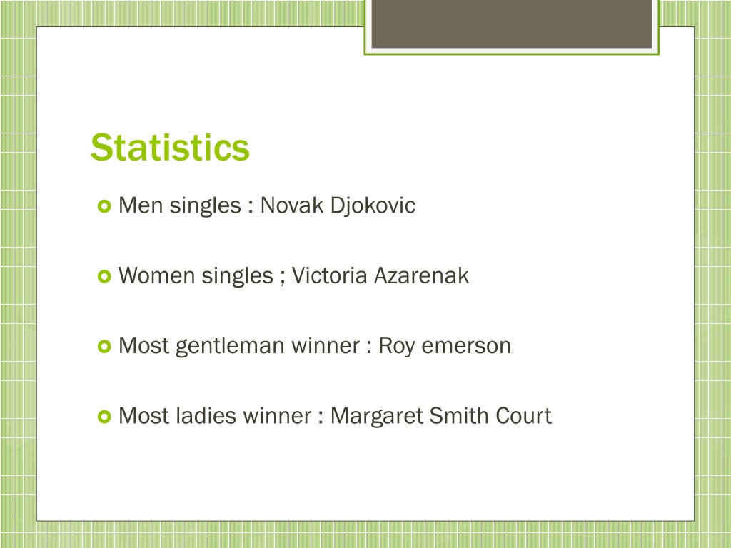 Statistics • Men singles : Novak Djokovic • Women singles ; Victoria Azarenak • Most gentleman winner : Roy emerson • Most ladies winner : Margaret Smith Court