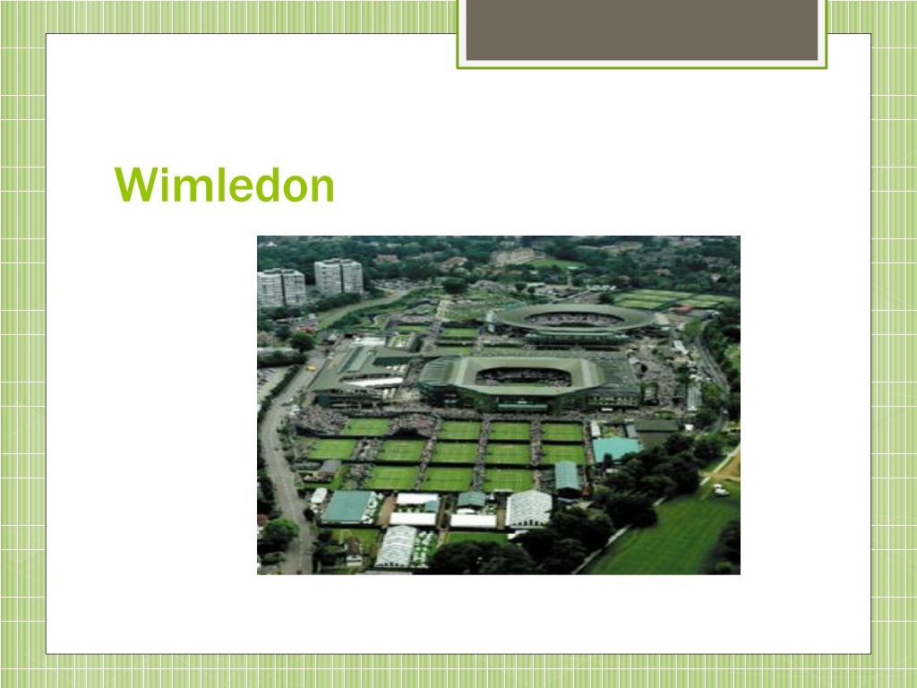 Wimbledon • Is the oldest of Major, was founded in 1877 • Is played on Grass • London • Takes places 2 weeks in late June, early July