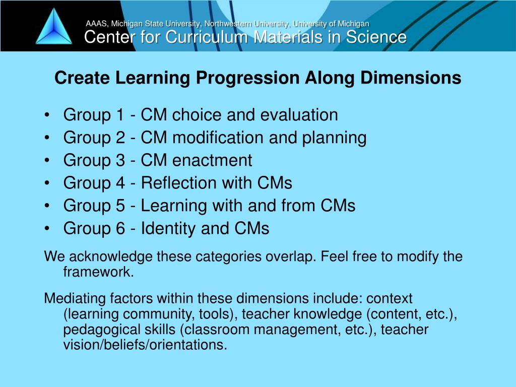 Create Learning Progression Along Dimensions • Group 1 - CM choice and evaluation • Group 2 - CM modification and planning • Group 3 - CM enactment • Group 4 - Reflection with CMs • Group 5 - Learning with and from CMs • Group 6 - Identity and CMs We acknowledge these categories overlap. Feel free to modify the framework. Mediating factors within these dimensions include: context (learning community, tools), teacher knowledge (content, etc.), pedagogical skills (classroom management, etc.), teacher vision/beliefs/orientations.