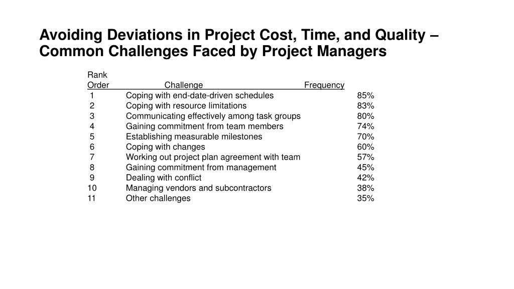 Avoiding Deviations in Project Cost, Time, and Quality – Common Challenges Faced by Project Managers RankOrder Challenge Frequency 1 Coping with end-date-driven schedules 85% 2 Coping with resource limitations 83% 3 Communicating effectively among task groups 80% 4 Gaining commitment from team members 74% 5 Establishing measurable milestones 70% 6 Coping with changes 60% 7 Working out project plan agreement with team 57% 8 Gaining commitment from management 45% 9 Dealing with conflict 42% 10 Managing vendors and subcontractors 38% 11 Other challenges 35%