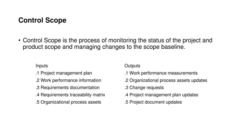 Control Scope • Control Scope is the process of monitoring the status of the project and product scope and managing changes to the scope baseline.