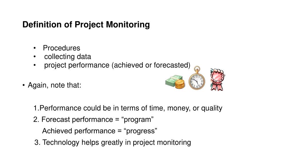 Lesson 1: Examining Professional Project Management Topic 1A: Identify Project Management Processes. Definition of Project Monitoring. Procedures collecting data project performance (achieved or forecasted) Again, note that: Performance could be in terms of time, money, or quality