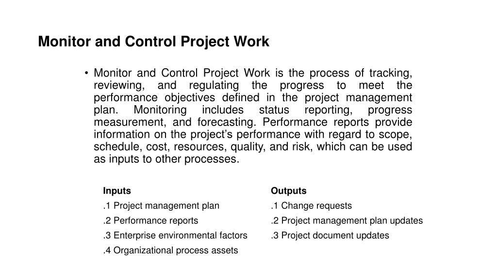 Monitor and Control Project Work • Monitor and Control Project Work is the process of tracking, reviewing, and regulating the progress to meet the performance objectives defined in the project management plan. Monitoring includes status reporting, progress measurement, and forecasting. Performance reports provide information on the project’s performance with regard to scope, schedule, cost, resources, quality, and risk, which can be used as inputs to other processes.
