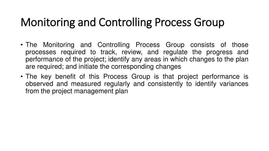 Monitoring and Controlling Process Group • The Monitoring and Controlling Process Group consists of those processes required to track, review, and regulate the progress and performance of the project; identify any areas in which changes to the plan are required; and initiate the corresponding changes • The key benefit of this Process Group is that project performance is observed and measured regularly and consistently to identify variances from the project management plan