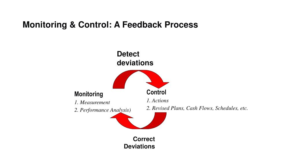 Monitoring & Control: A Feedback Process • Detect deviations Control 1. Actions 2. Revised Plans, Cash Flows, Schedules, etc. Monitoring 1. Measurement 2. Performance Analysis) • Correct Deviations