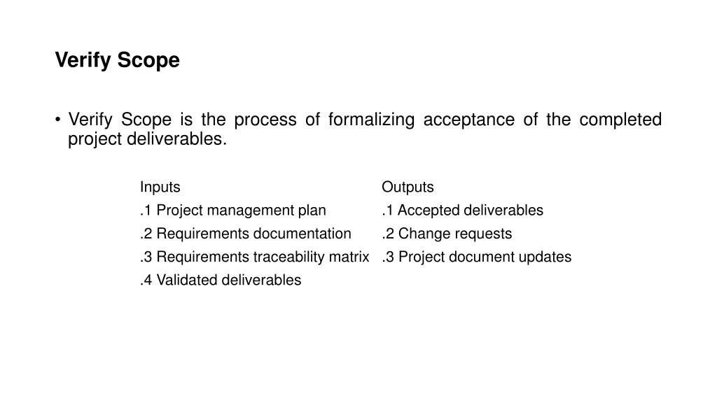 Verify Scope • Verify Scope is the process of formalizing acceptance of the completed project deliverables.