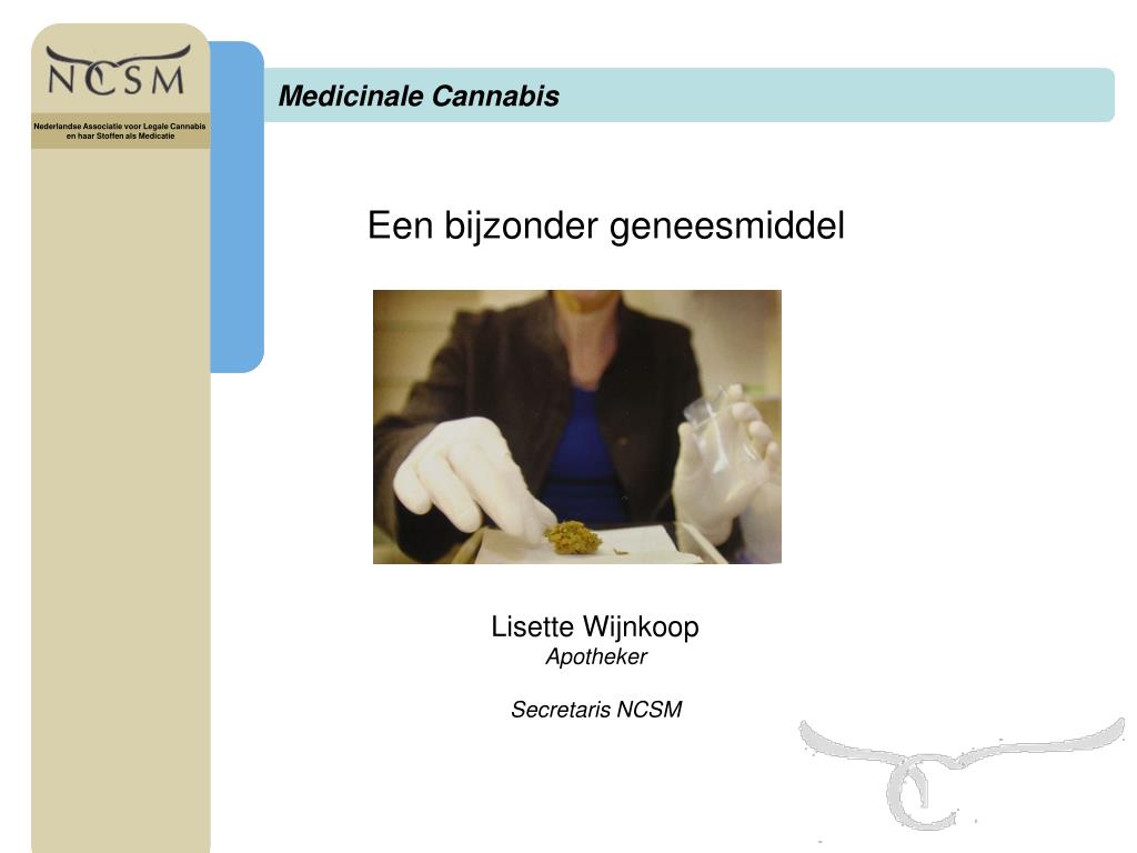 Medicinale Cannabis Nederlandse Associatie voor Legale Cannabis en haar Stoffen als Medicatie Een bijzonder geneesmiddel Lisette Wijnkoop Apotheker Secretaris NCSM