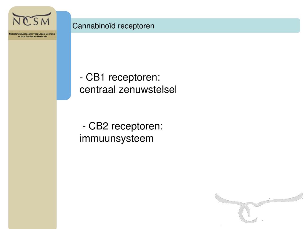 Cannabinoïd receptoren Nederlandse Associatie voor Legale Cannabis en haar Stoffen als Medicatie • CB1 receptoren: • centraal zenuwstelsel • - CB2 receptoren: immuunsysteem