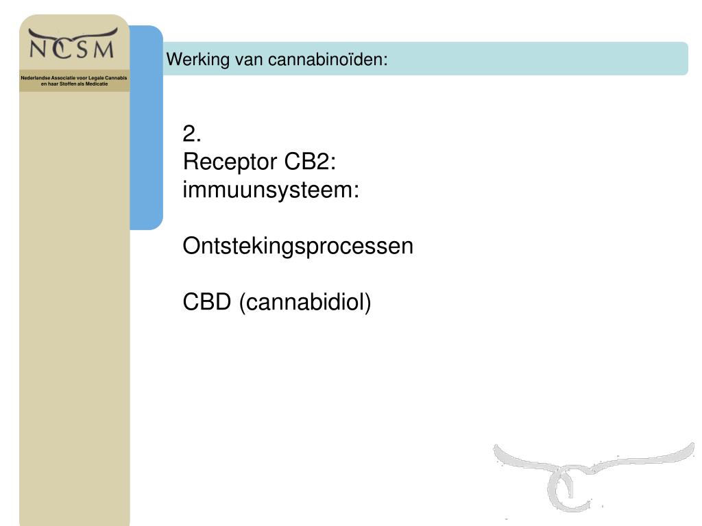 Werking van cannabinoïden: Nederlandse Associatie voor Legale Cannabis en haar Stoffen als Medicatie 2. Receptor CB2: immuunsysteem: Ontstekingsprocessen CBD (cannabidiol)