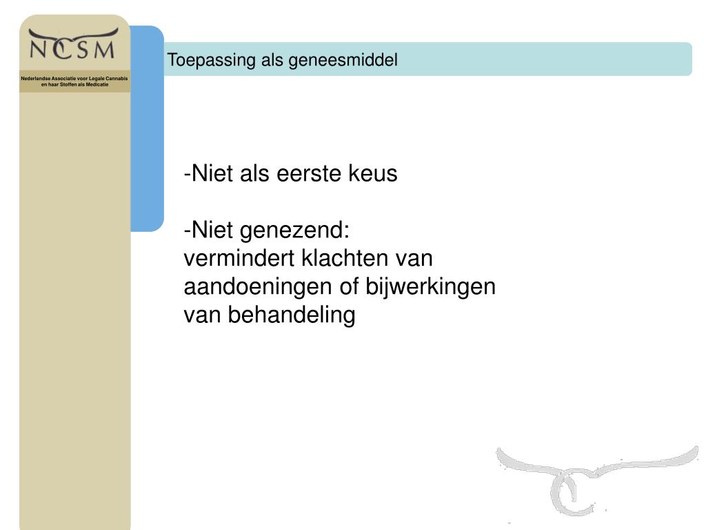 Toepassing als geneesmiddel Nederlandse Associatie voor Legale Cannabis en haar Stoffen als Medicatie -Niet als eerste keus -Niet genezend: vermindert klachten van aandoeningen of bijwerkingen van behandeling
