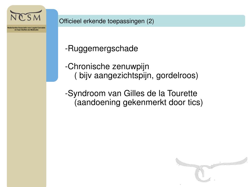 Officieel erkende toepassingen (2) Nederlandse Associatie voor Legale Cannabis en haar Stoffen als Medicatie -Ruggemergschade -Chronische zenuwpijn ( bijv aangezichtspijn, gordelroos) -Syndroom van Gilles de la Tourette (aandoening gekenmerkt door tics)