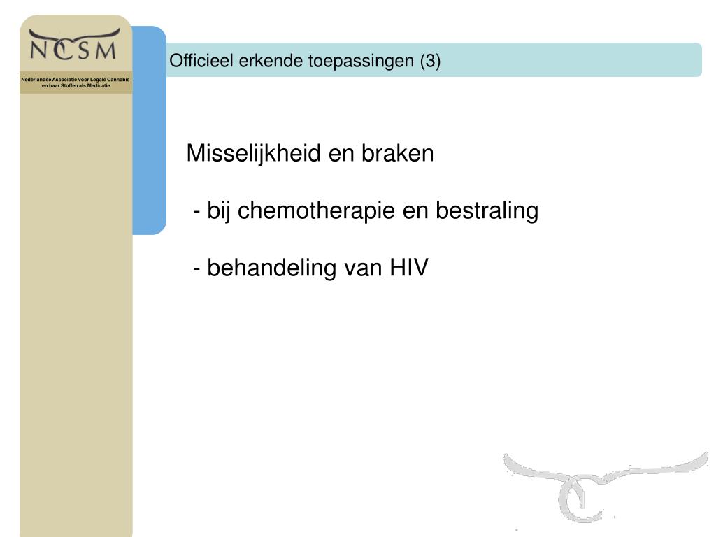 Officieel erkende toepassingen (3) Nederlandse Associatie voor Legale Cannabis en haar Stoffen als Medicatie Misselijkheid en braken - bij chemotherapie en bestraling - behandeling van HIV